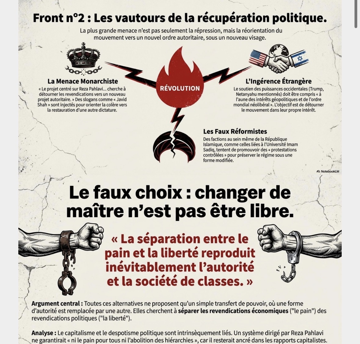 Les philosophes obscurs en avant pour la troisième guerre mondiale ! Nous venons de voir la situation tragique des prolétaires en Iran : certains sont morts, d’autres ont été gravement blessés lors de bombardements menés par la bourgeoisie dite des « philosophes obscurs », idéologues libertarianistes. Il ne faut pas non plus tomber dans le campisme gauchiste, qui viendrait défendre la théologie islamique incarné par les mollahs, eux-mêmes soutenus par la bourgeoisie nationale. Être campiste, c’est choisir un maître plutôt qu’un autre, légitimer un exploiteur contre un autre. Or, n’importe quelle bourgeoisie sait très bien s’unir dans la lutte des classes lorsque celle-ci est menacée par la colère populaire. Le meilleur moyen de briser cette unité bourgeoise reste l’auto-organisation du prolétariat et la solidarité a-nationaliste. Il faut le dire très fort, encore plus fort : Ni Shah, Ni Mollah, Ni Bourgeoisie. Actuellement, la situation internationale dégénère. La bourgeoisie mondiale annonce la mort, par exécution lors de bombardements, de Khamenei. Cette mort est synonyme d’une accélération vers un conflit mondial, dans lequel le prolétariat subira un génocide organisé par la bourgeoisie. Bien sûr, nous n’allons pas pleurer un dictateur sanguinaire, qui a pourchassé le prolétariat iranien par une répression sanglante. Mais cette mort ne signifie en rien une émancipation. Elle sert avant tout de carburant à la guerre capitaliste et prépare de nouvelles formes de domination. Et voilà que les gauchistes ont largement contribué à cette atmosphère en apportant leur soutien à un campisme puant, allant jusqu’à défendre une théologie infâme au nom d’un pseudo anti-impérialisme. En soutenant un camp contre un autre, ils trahissent le prolétariat et participent à la légitimation de nouveaux massacres. La bourgeoisie mondiale, sous toutes ses formes religieuse ou laïque, nationale ou internationale mène le prolétariat à l’abattoir. Face à cela, aucune illusion, aucun alignement, aucun compromis. La seule voie reste la lutte autonome du prolétariat contre toutes les bourgeoisies, contre tous les États, contre toutes les religions extrémistes. C’est ici que la NÉGAGUERRE devient une nécessité politique vitale. La négaguerre, ce n’est pas la paix bourgeoise, ni le pacifisme moral. La négaguerre, c’est le refus total de l’union sacrée, le refus de mourir pour un État, une religion ou un capital. La négaguerre, c’est la guerre sociale contre toutes les bourgeoisies, contre tous les camps, contre toutes les armées. L'émancipation des travailleurs seront l'œuvre d'eux même ! Viva la révolution sociale !